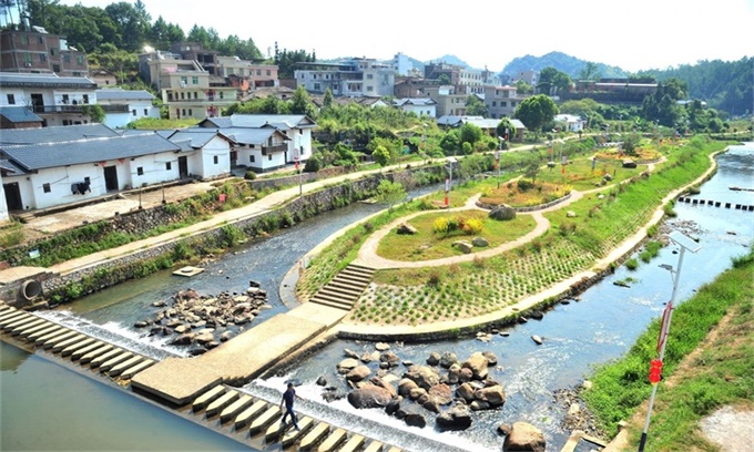 長沙圩鎮碧道鋪設了瀝青并劃分跑道和自行車道,“顏值”再獲提升。(林翔?攝)位于梅江河圩鎮段碧道沿線的紅色休閑廣場效果....